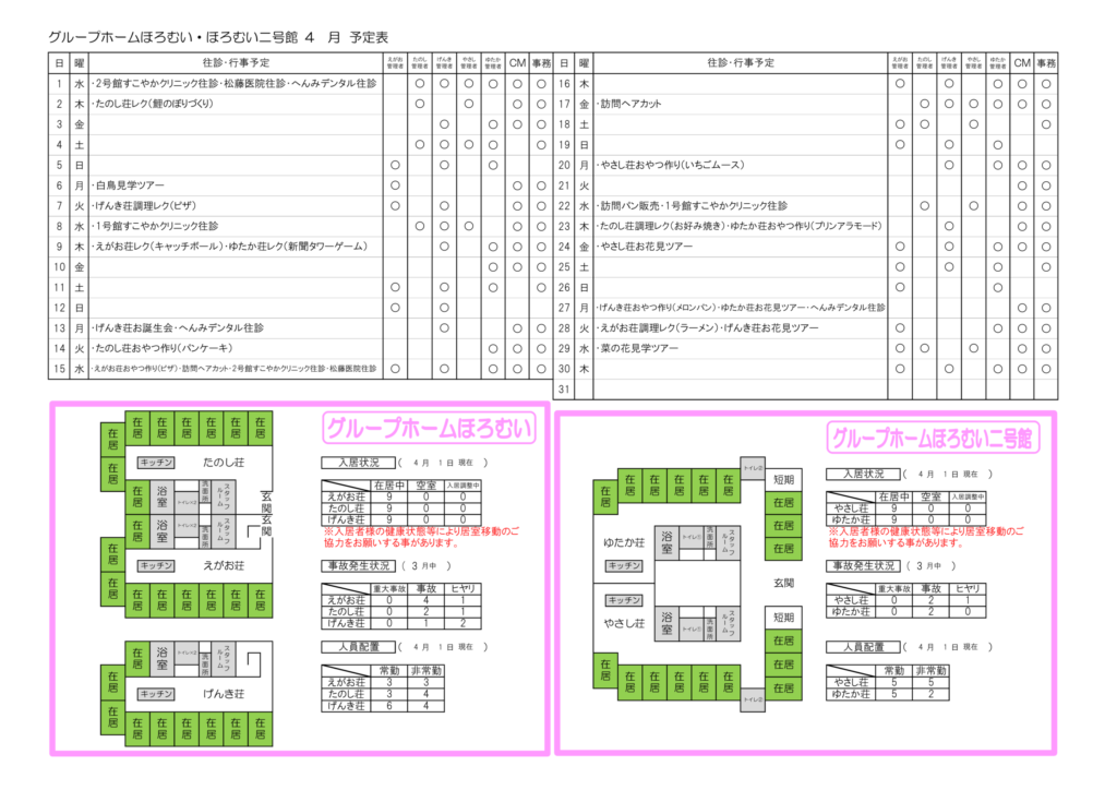 グループホーム白鳥見学や菜の花見学では、利用者さんの移動負担を抑えつつ、車窓やバリアフリーな環境で春を感じられるように工夫しています。