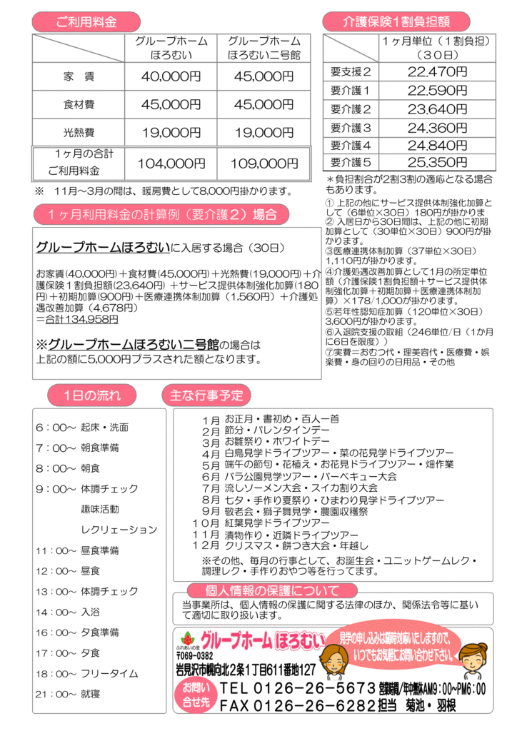 | 日常生活費 | グルプホーム ほろむい | グループホーム ほろむい二号館 |